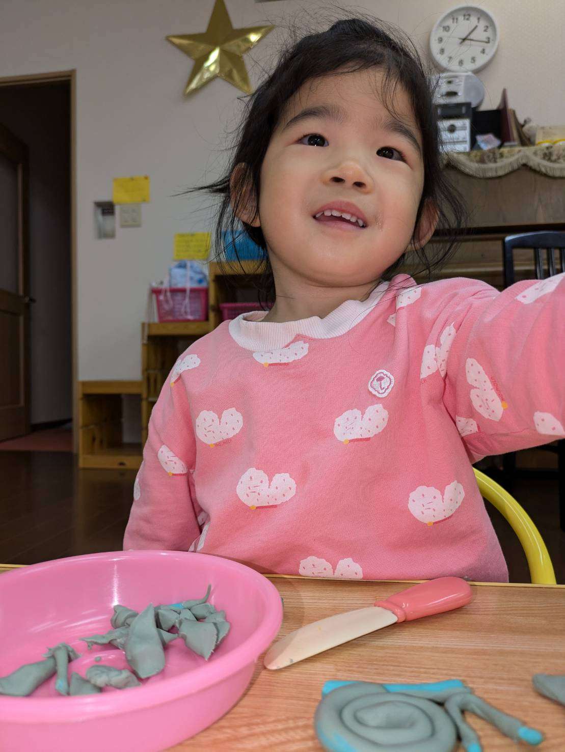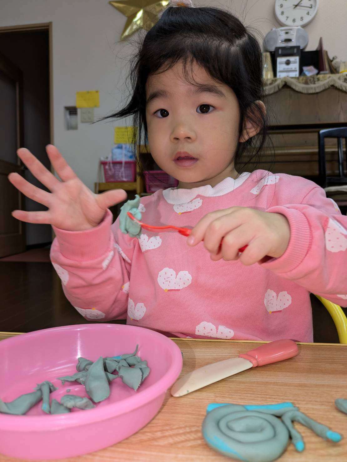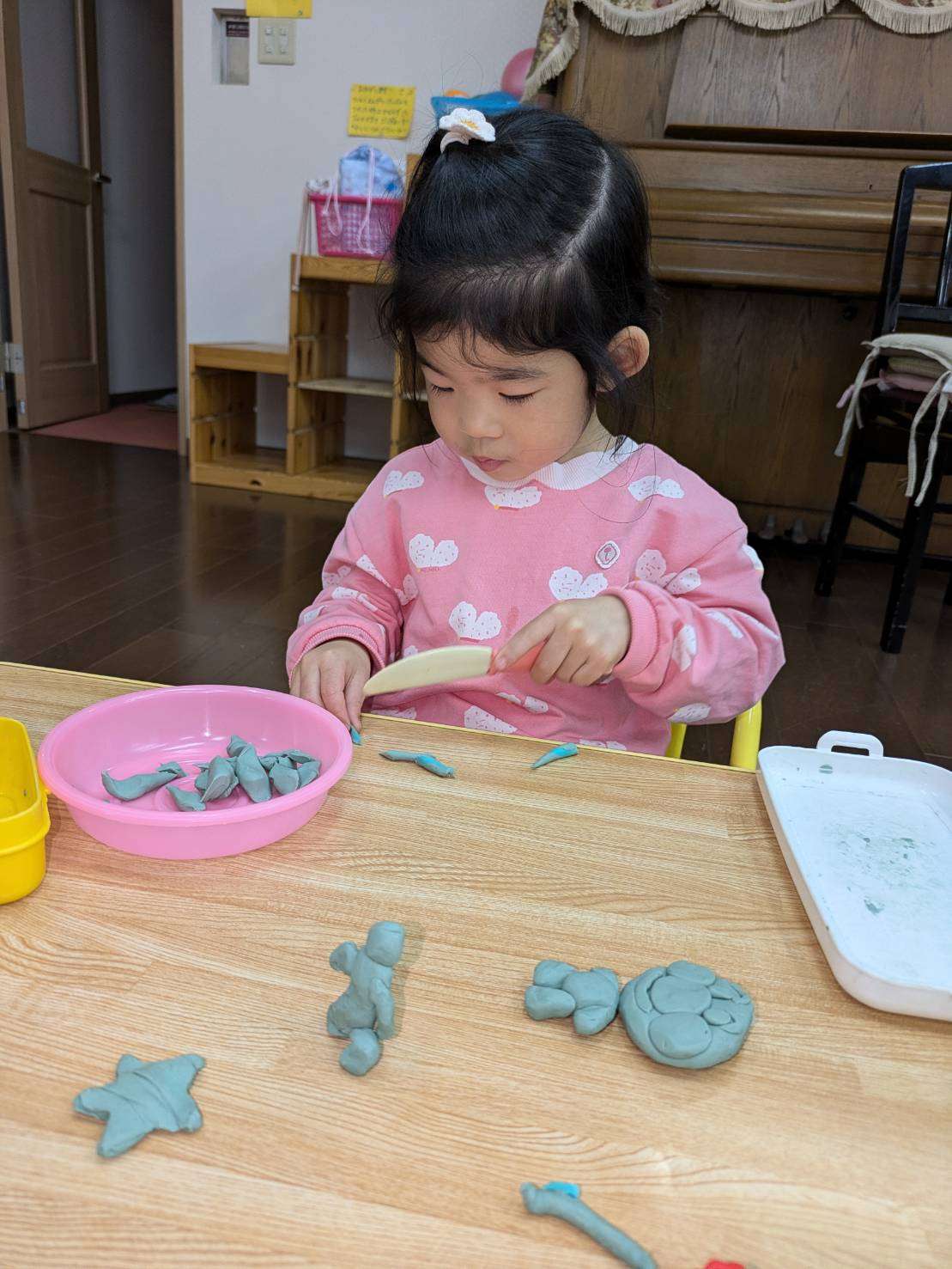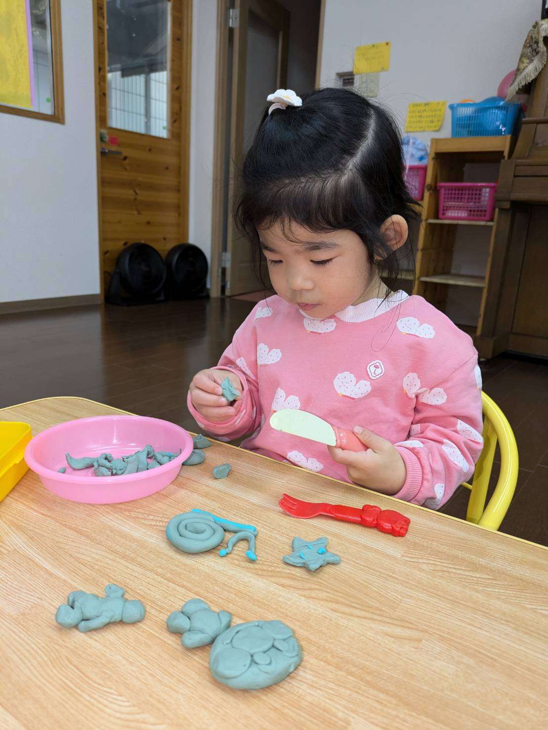わんぱくポケット保育園⭐️ 2025/04/16 わんぱくさんの楽しい1日⭐ 夕方のお散歩⭐ 粘土遊び✨ 今日は粘土で遊びました😊 おもちゃの包丁て切ってお皿に並べたよ😊 シェフのようにとても器用に遊べています💕 今日は午前中と夕方の2回のお散歩でした✨ 沢山歩いて楽しかったね❤️