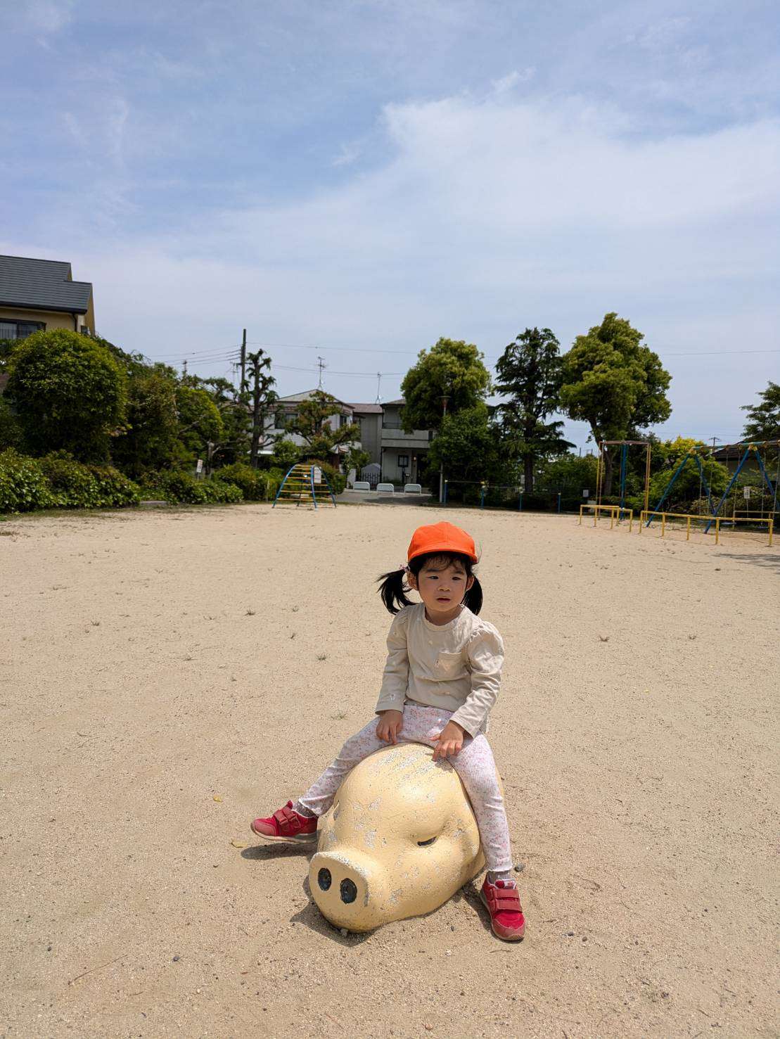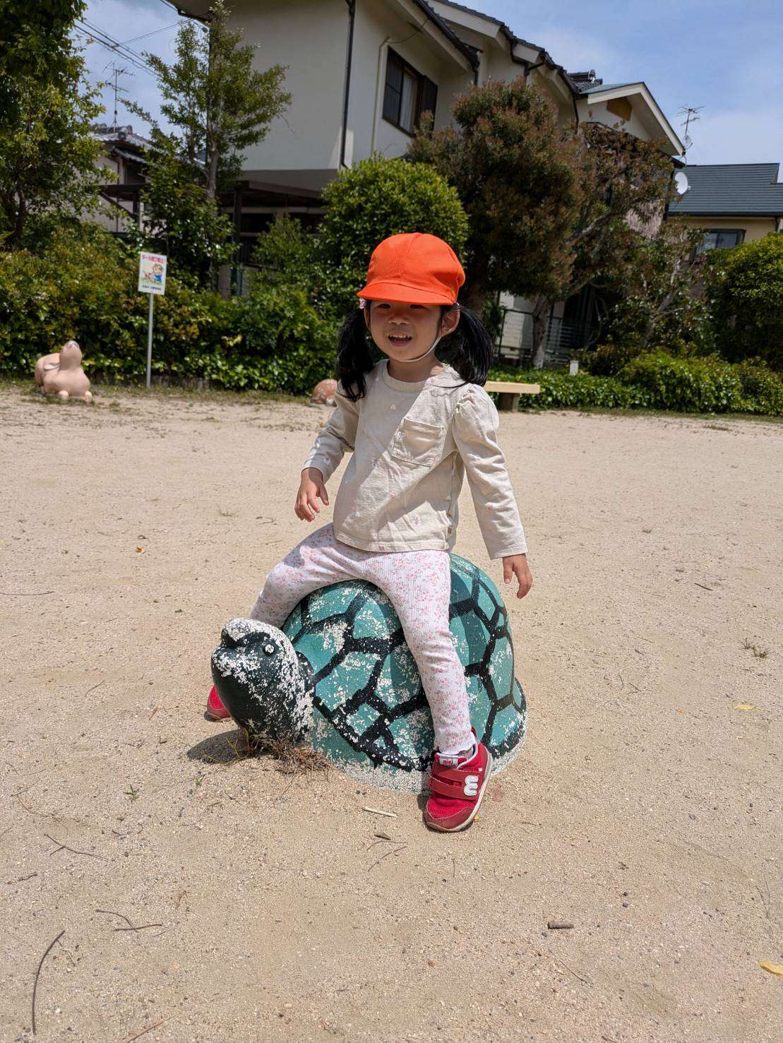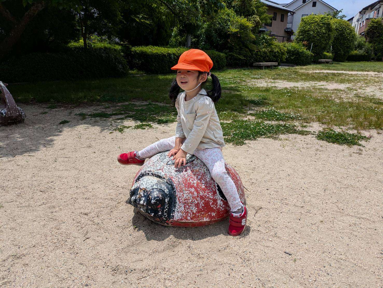 わんぱくポケット保育園⭐️ 2025/05/15 お散歩お散歩⭐ 今日も朝からご機嫌で沢山色んな事をして遊んだ1日でした。⭐ お弁当を持って今日は坂道を上り、広い公園まてお出かけしました。色んな動物や虫の石像があり、一つ一つまたがりご満悦です🤗♥️