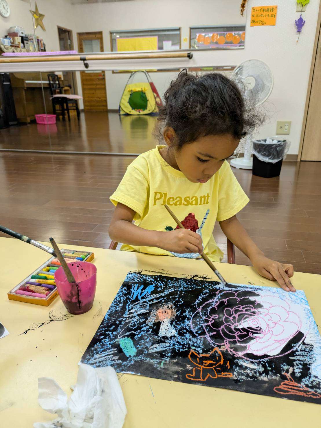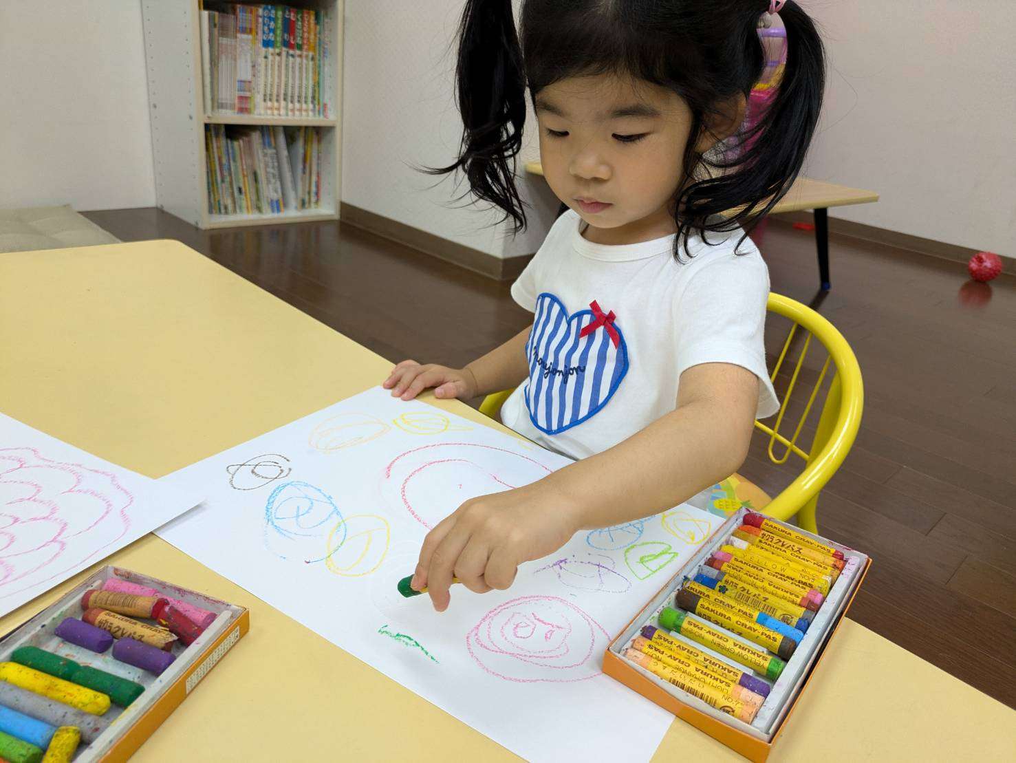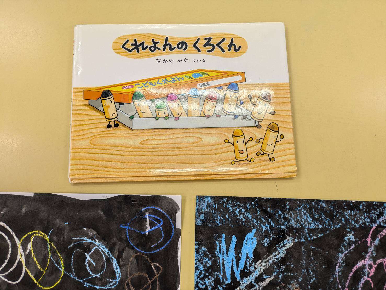 わんぱくポケット⭐️ 2025/06/12 わんぱくさんの楽しい1日⭐ 1年ぶりにアメリカ🇺🇸から帰ってきたお友達との再会❤️ お互い大きくなって。少しお姉さんになりました✨ でも、お互いなんだか覚えてるみたいであっという間に仲良く遊びは初めました。 モニョモニョお話しています。🤗❤️ 今日は「クレヨンのくろくん」の絵本を読んでから白い画用紙にクレヨンでカラフルにお絵かきしてから真っ黒い絵の具で塗りつぶして色が鮮やかに浮き出てくるのを楽しみました🌈