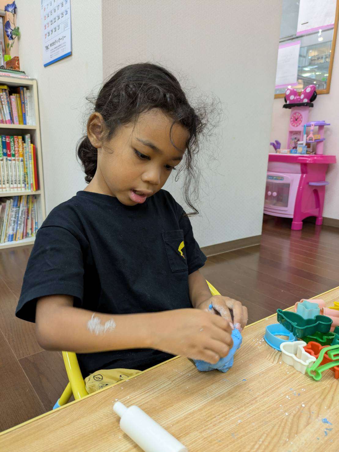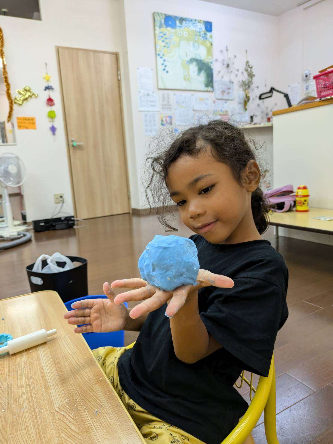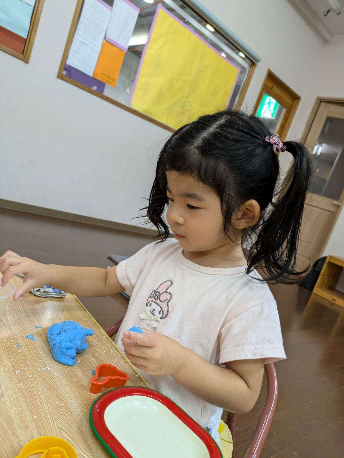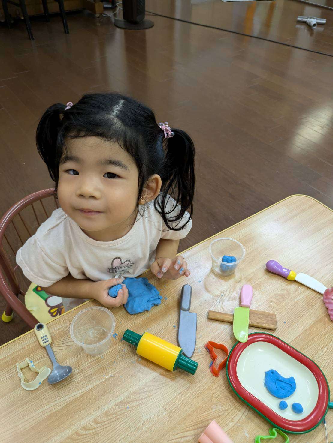 わんぱくポケット保育園⭐️ 2025/06/26 青色の小麦粉粘土遊び✨ 鮭とひじきごはん⭐️丸天付き♥️ 全部残さず食べました✨ 苦手な鮭を克服しました😆 魚釣り🎣 今日は小麦粉粘土の色を変えて新たに青色粘土を粉から作りました🤗✨ 若干教室が粉っぽいのですが、ふわふわ柔らかい感触の小麦粉粘土に子ども達はもう夢中です。🐸 何度もお片付けしてランチにしようと誘いましたが、全て断られようやく遊び始めて1時間後に片付けを承諾してくれました✨ とことん遊べるのも、小さい保育園だからこそのメリットだな〜。なんて思います😊♥️ ランチのあとは床をピカピカに拭いて綺麗にお掃除✨ 放課後倶楽部では魚の絵を描いて魚釣り遊びをしました🎣🐟️🐠🐟️