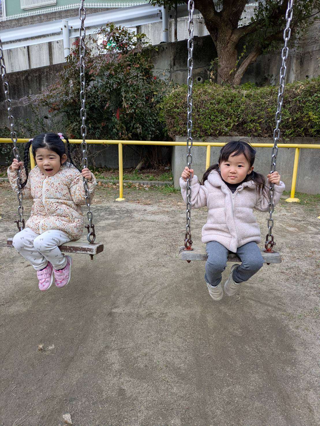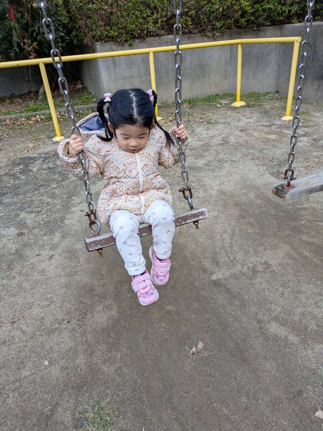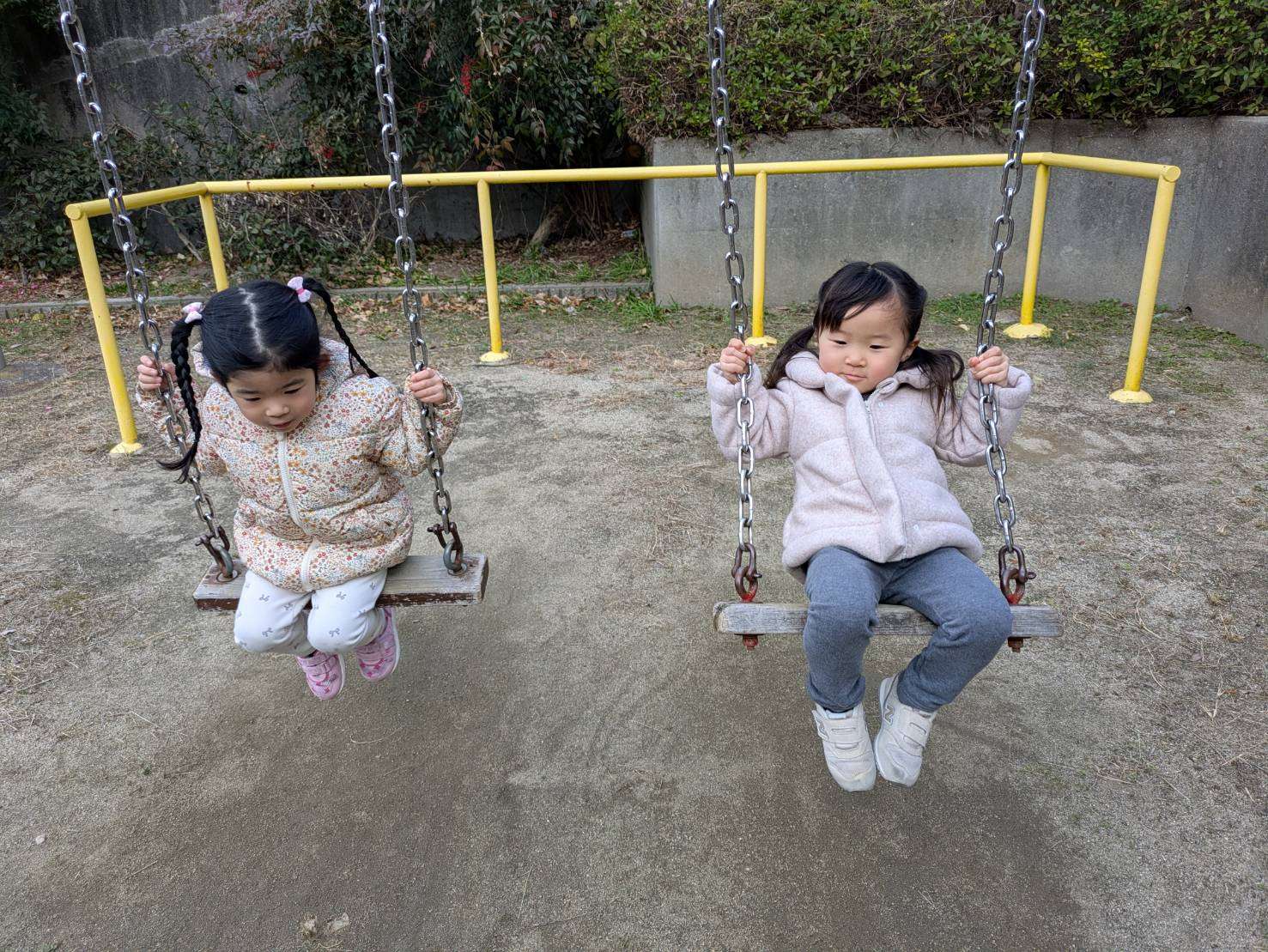 前まで少し怖かった足の届かないブランコもお友達と一緒なら乗れるようになり今日は寒空の下長い時間ブランコに揺られていました。