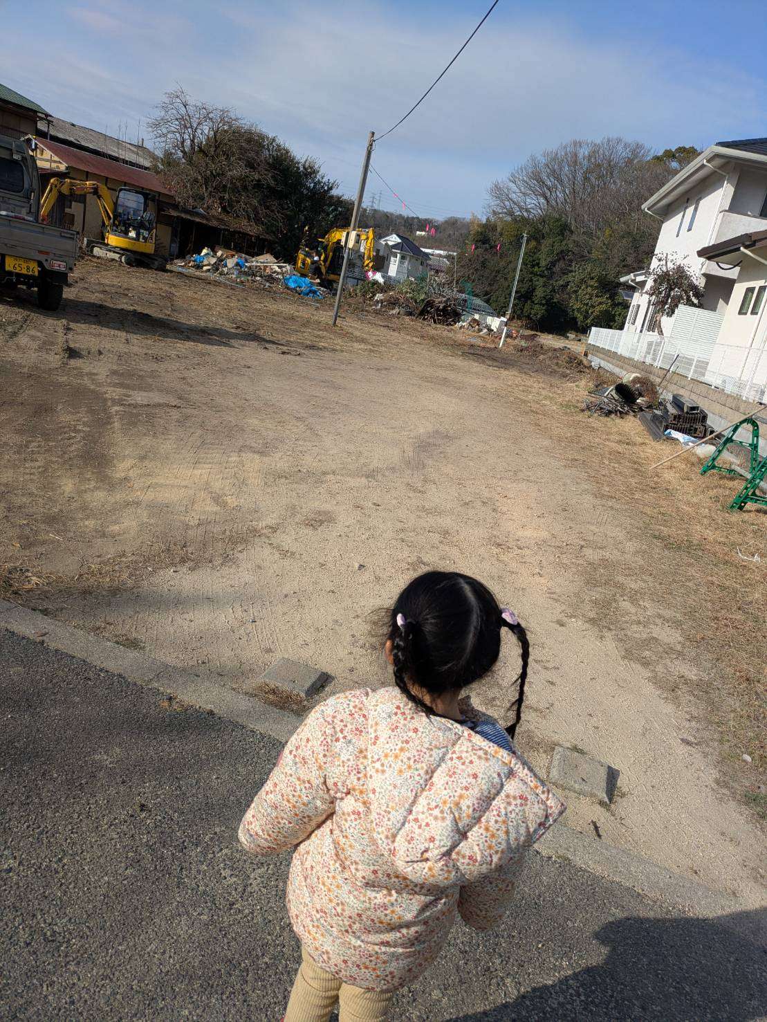 大きな重機で伐採されていました。本当は近くに行きたかったけど少し遠目で2人暫く眺めていました。