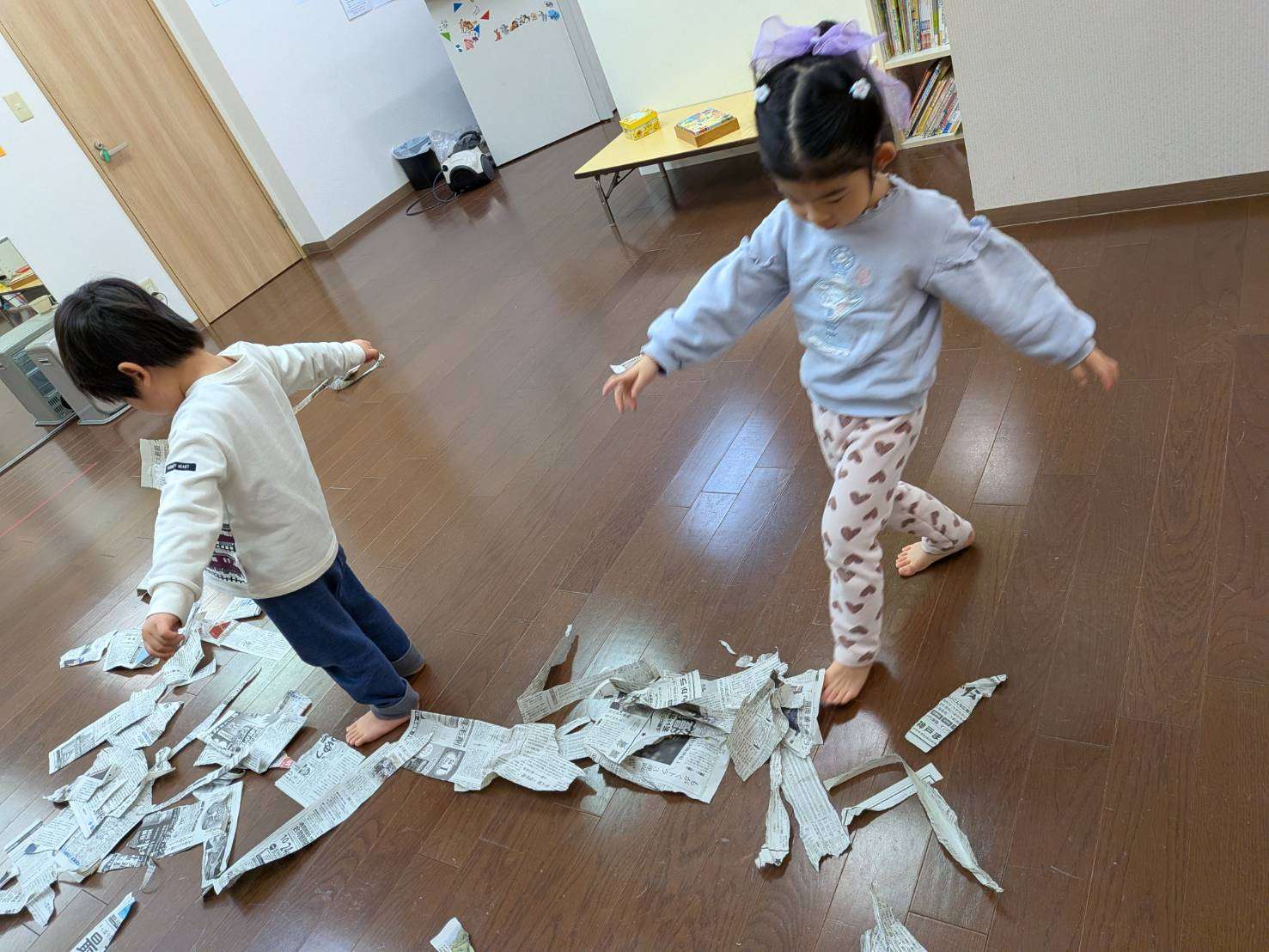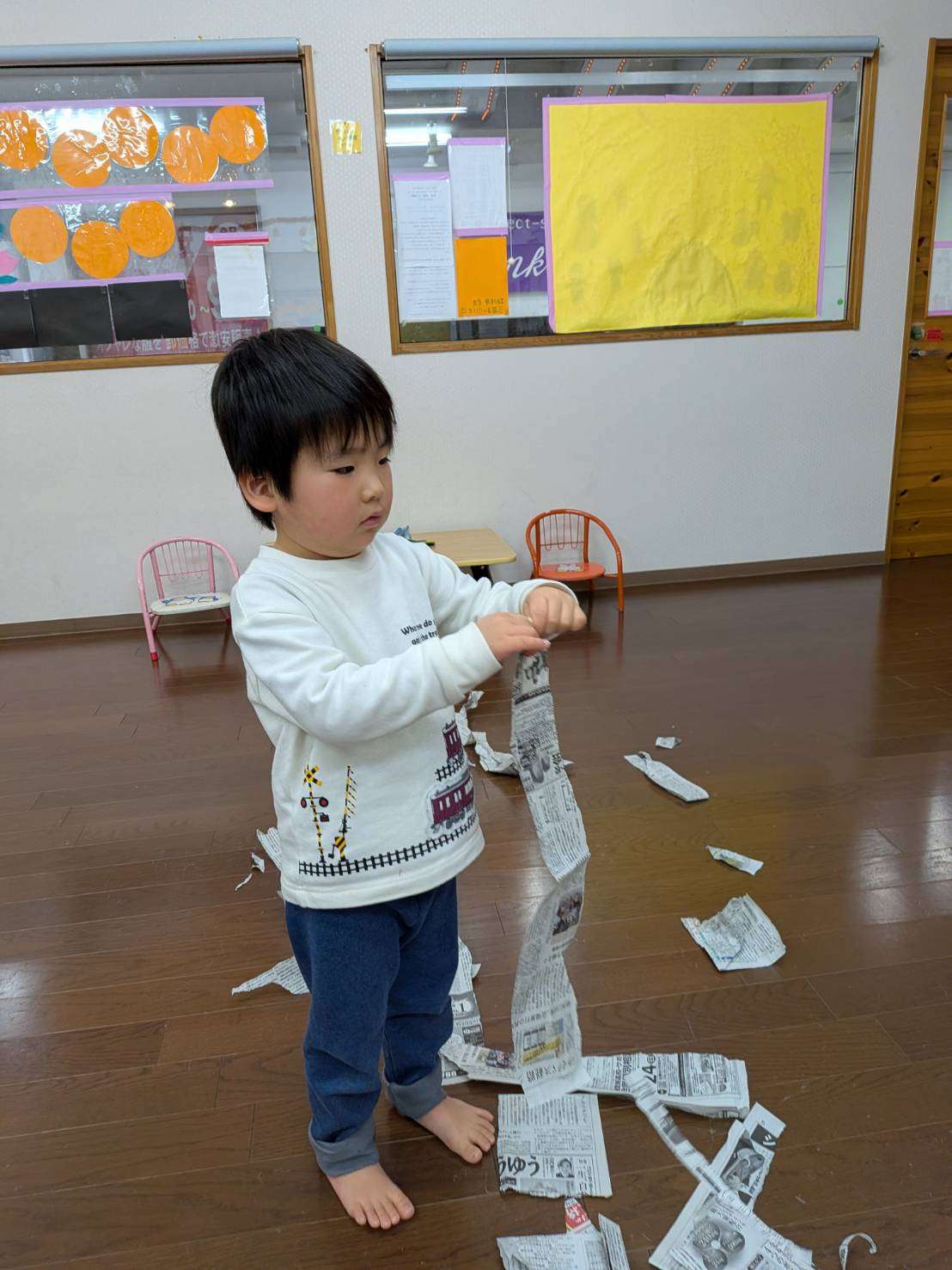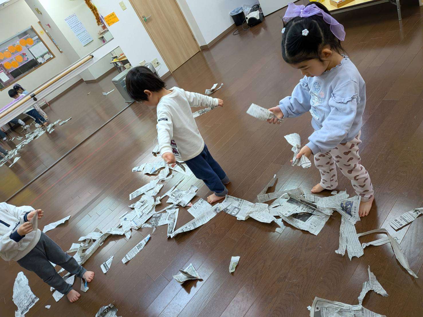 わんぱくさんの楽しい1日⭐ 2026/02/19 新聞ビリビリ遊び📰 今日は久しぶりにみんなで揃って思う存分遊びました😆⭐ 仲良く穏やかな時間が流れています。🤗💕 今日は家庭で見られなくなった新聞紙を広げてみんなで遊びました📰 先生の手品から始まりビリビリ破り、おにぎりみたいに丸めて投げてぶつけ合い。最後はビニール袋に入れてビニールボールにしてフープに入れる追いかけ遊びもしました。🏃🏃 みんな息を切らしながらも楽しくてなかなか止まらず元気いっぱいです✨